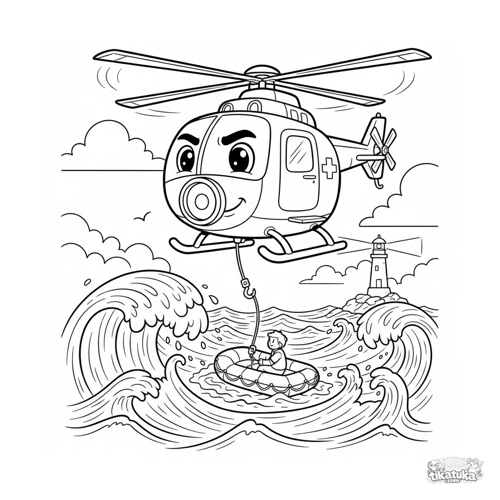 Coloring page of a rescue helicopter hovering over a stormy ocean. For kids 4-6 years old. Bold dynamic scene, clear shapes.