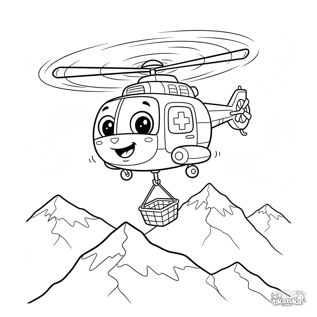 Coloring page of a rescue helicopter hovering over snowy mountains. For kids 4-6. Helicopter with smiling windows and a rescue basket. Simple, clear shapes.