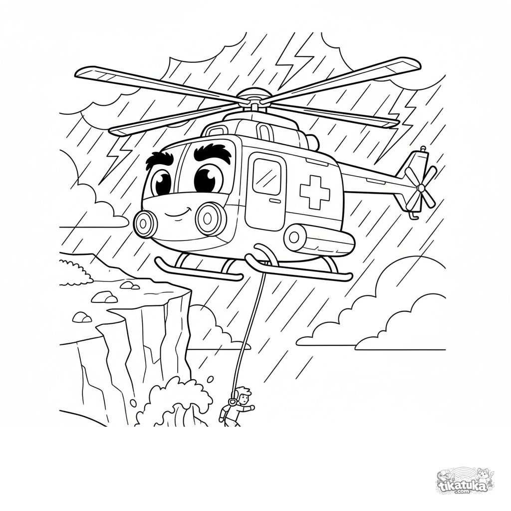 Dynamic coloring page of a rescue helicopter operating in a storm near a rocky cliff. For kids aged 7-9. Expressive lines, dramatic scene.