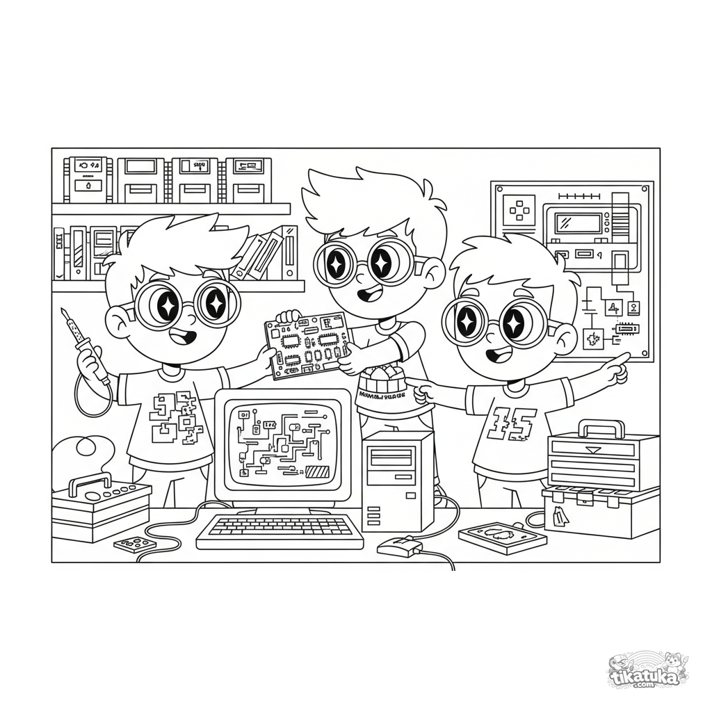 Coloring page for ages 10-12: a retro computer club meeting in a basement workshop. Lots of details: old monitors, soldering irons, schematics, and game cartridges.