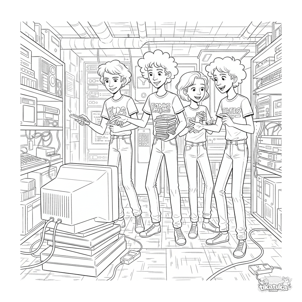 Coloring page for ages 10-12: a retro computer club meeting in a basement server room. Teens discuss code among old monitors and keyboards. Detailed scene.