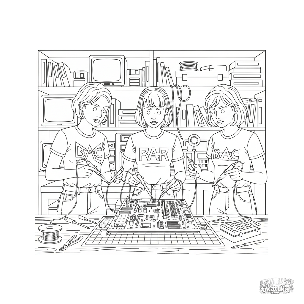 Detailed coloring page: three friends repairing a retro computer in a basement club. Scene with soldering iron, monitors, tools. For kids 10-12.