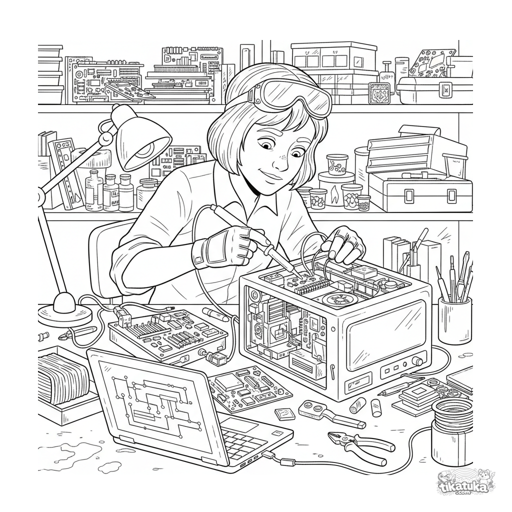 Detailed coloring page: a retro computer modder at work in a basement workshop. Many elements: tools, schematics, parts. For ages 10-12.