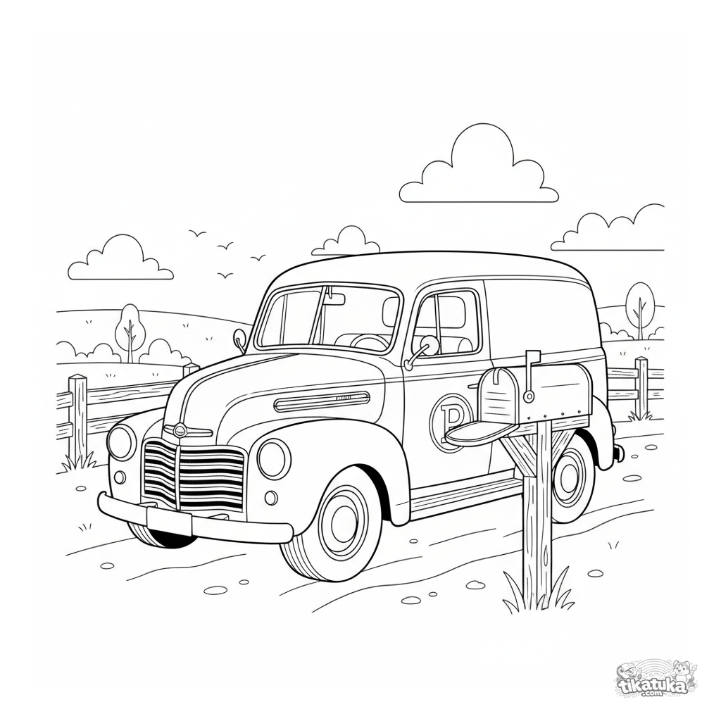 Coloring page for boys 4-6: a vintage delivery truck parked by a rural mailbox. A detailed yet clear scene, perfect for coloring.