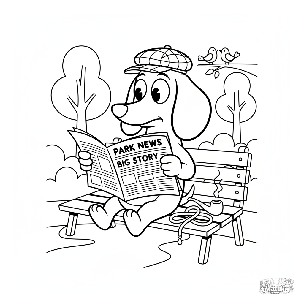 Coloring page for kids 7-9 in retro style: a dachshund in a flat cap reads a newspaper intently while sitting on a park bench. A fun scene with vintage mood.
