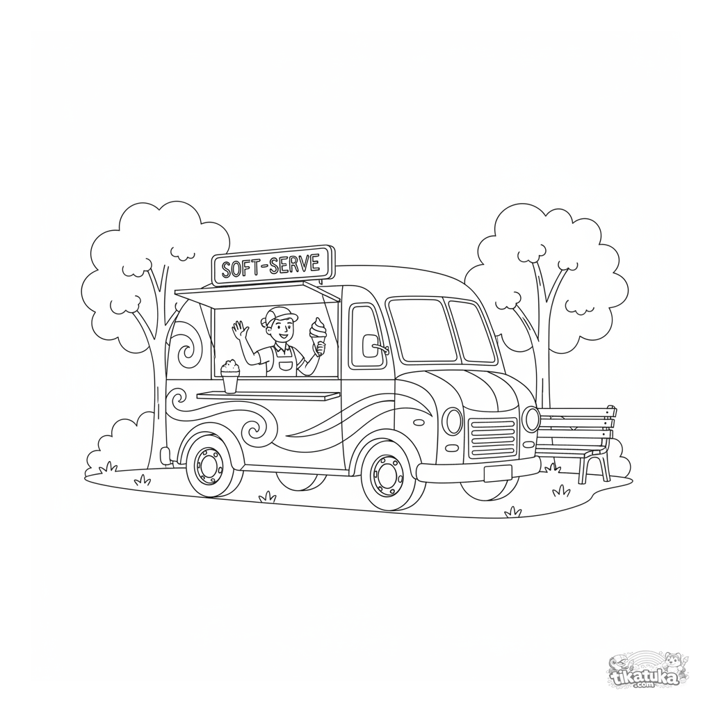 Realistic-style coloring page for boys 4-6: a retro food truck serving ice cream in a city park. Moderate detail with recognizable shapes.