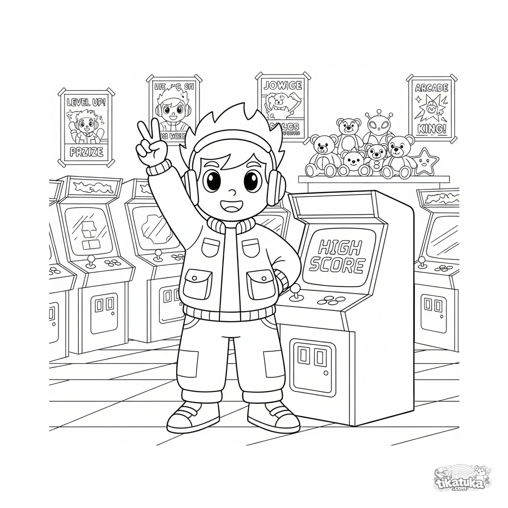 Coloring page for older kids: a retro gamer celebrates a high score in an arcade room filled with cabinets and posters. A detailed scene for engaged coloring.