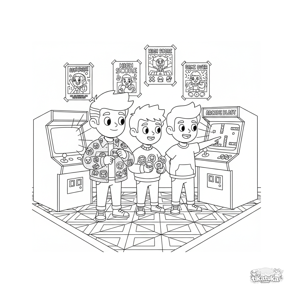Coloring page for kids 7-12: a trio of retro gamers collecting pins in a vibrant arcade room. Detailed scene with cabinets, posters, and patterned carpet.