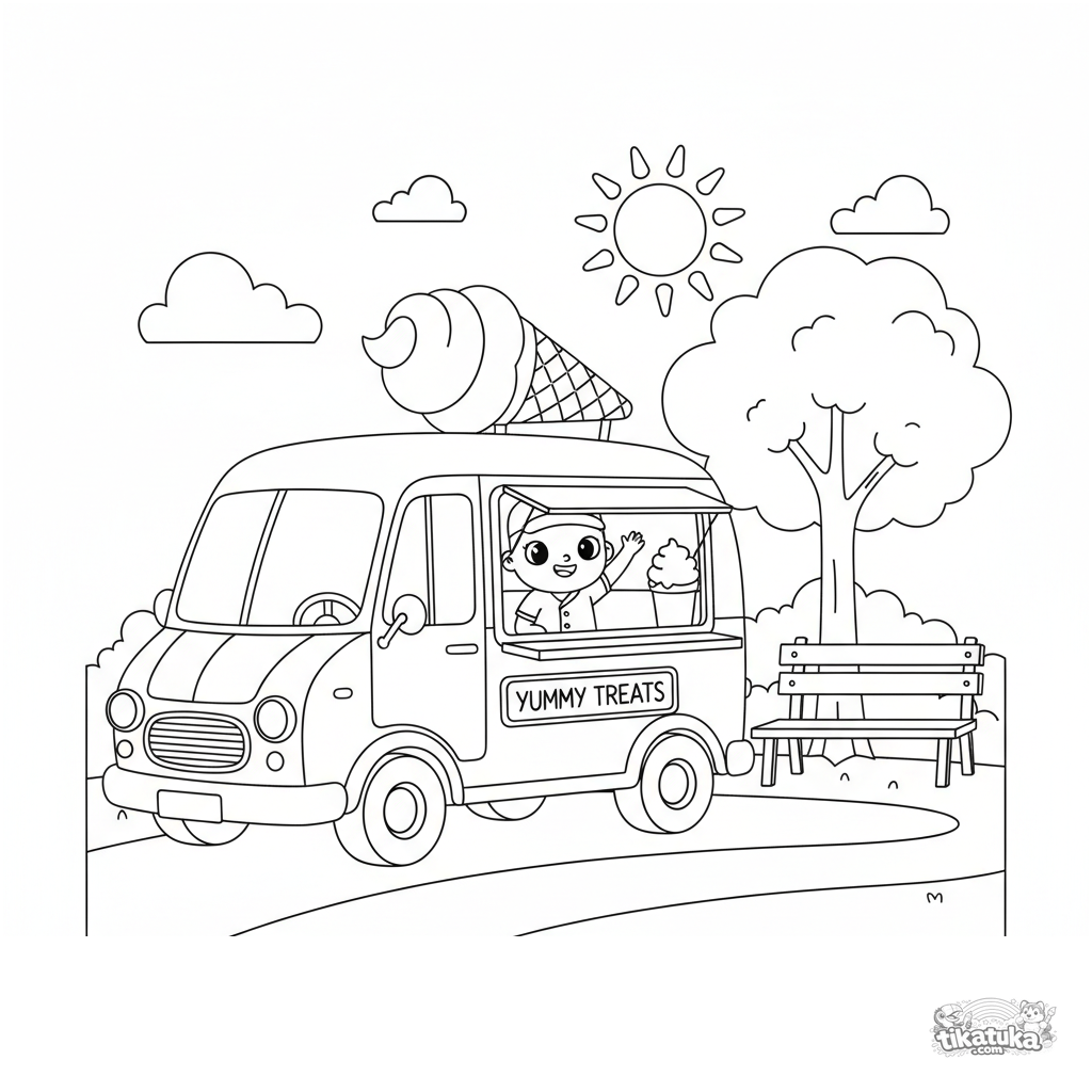Coloring page for boys 4-6: a cheerful retro ice cream truck parked at a park entrance. Recognizable shapes, moderate details, suitable for coloring.