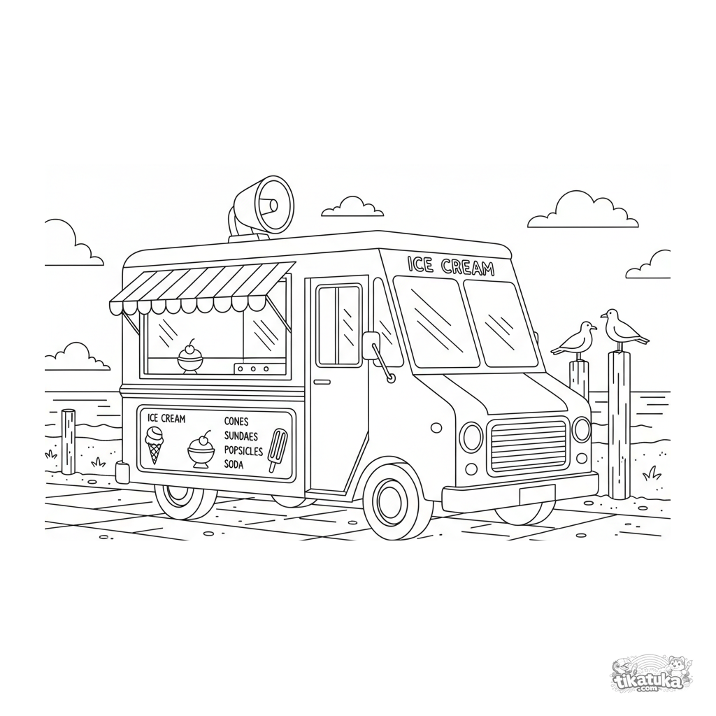 A coloring page for boys featuring a retro ice cream truck parked on a sunny beach promenade. A detailed yet clear scene for children aged 4-6.