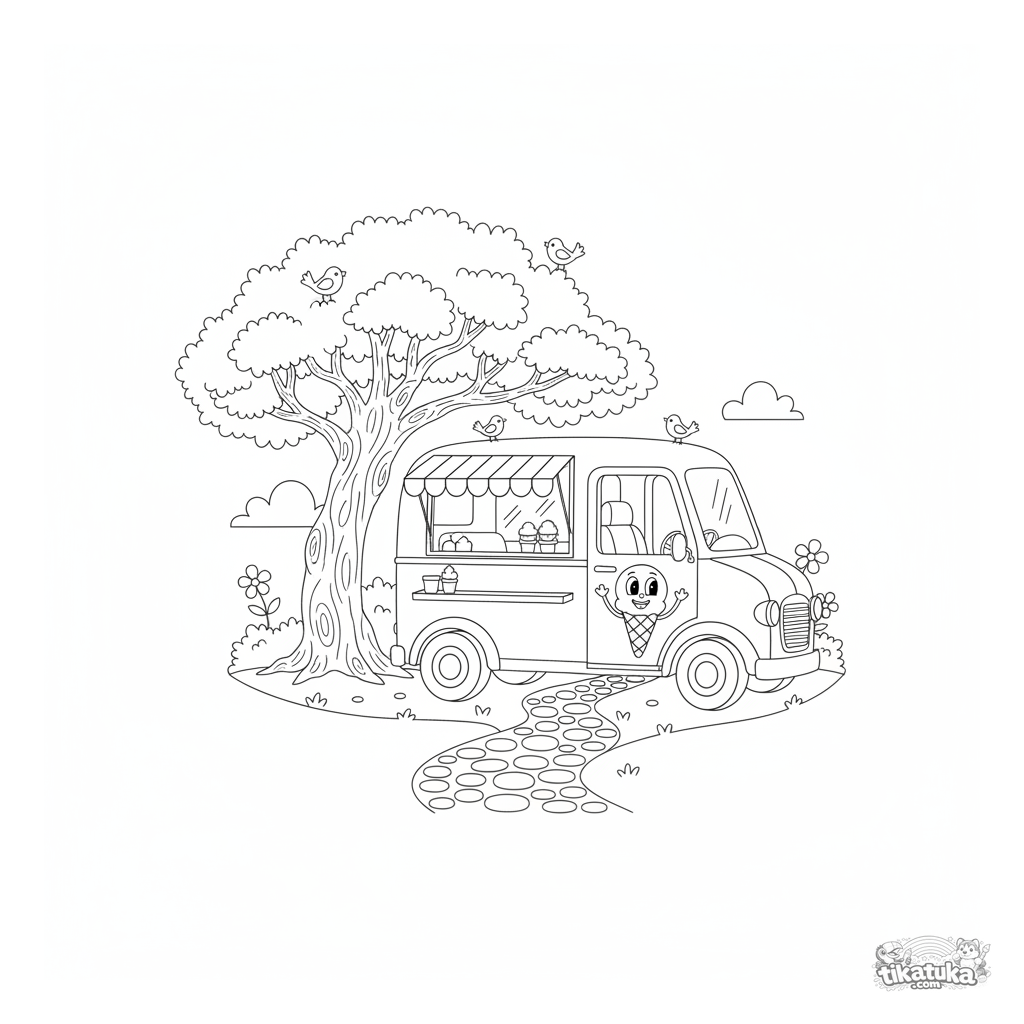 Coloring page for boys 4-6: a charming retro ice cream truck waits for customers under the shade of a large tree. A detailed and appealing vehicle to color.