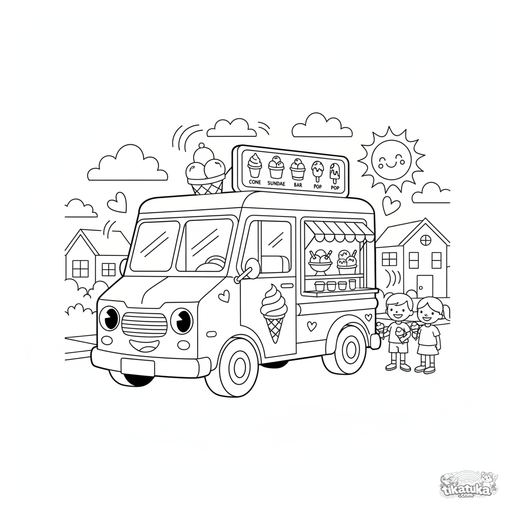Coloring page for boys 4-6: a happy retro ice cream truck with a smiling grill drives down a street. A bright, simple vehicle scene.