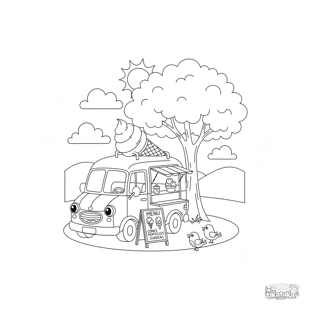 Coloring page for boys: a happy retro ice cream truck in a park. For kids aged 4-6. The truck has a smiling face, a cone on the roof, and an open serving window.