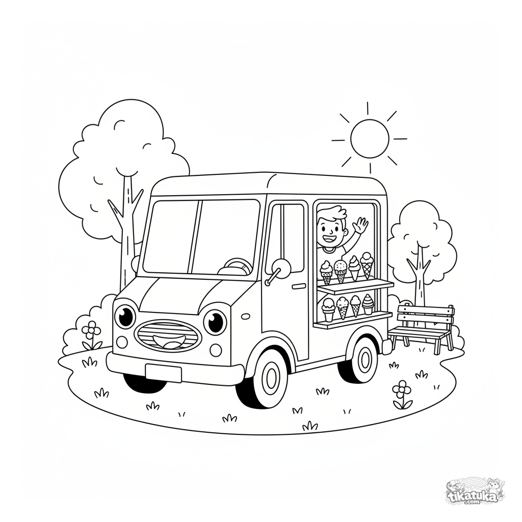 Coloring page for boys 4-6: a cheerful retro ice cream truck with a smiling face is parked in a sunny park. A bright and simple vehicle scene.