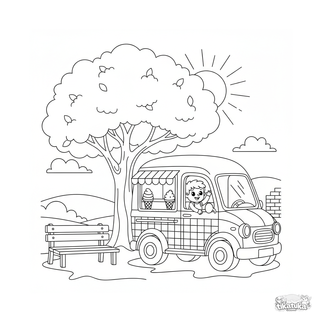 Coloring page for boys 4-6: a cheerful old-fashioned ice cream truck with a checker pattern is parked under a large tree on a sunny street.