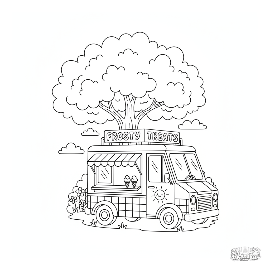 Coloring page for boys 4-6: a vintage ice cream truck with a checkerboard pattern parked under a large tree. Clear outlines and recognizable vehicle details.