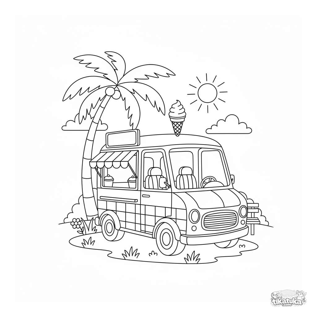 Coloring page for boys 4-6: a retro ice cream truck with a checkerboard pattern parked under a palm tree. Realistic style, recognizable vehicle details, moderate difficulty.