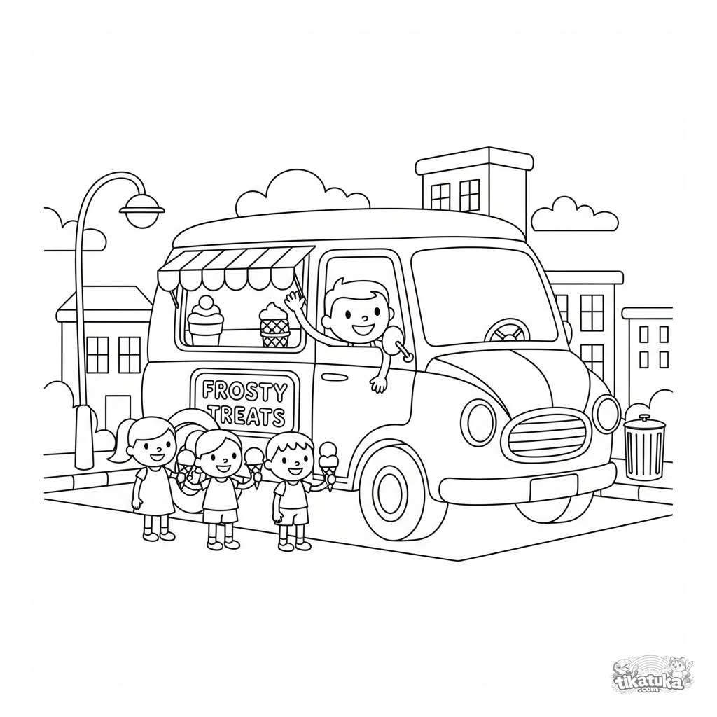 Coloring page for kids 4-6: a retro ice cream van on a city street. A cheerful driver serves treats to children. Simple shapes and clear outlines.