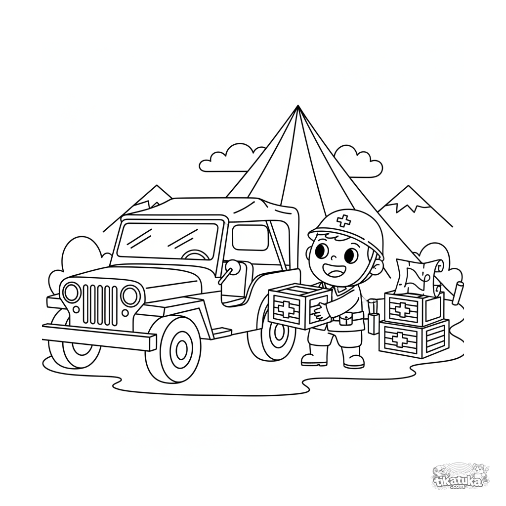 Coloring page for kids 4-6: a vintage army jeep unloading supply crates near a field headquarters with tents. Simple, clear outlines.