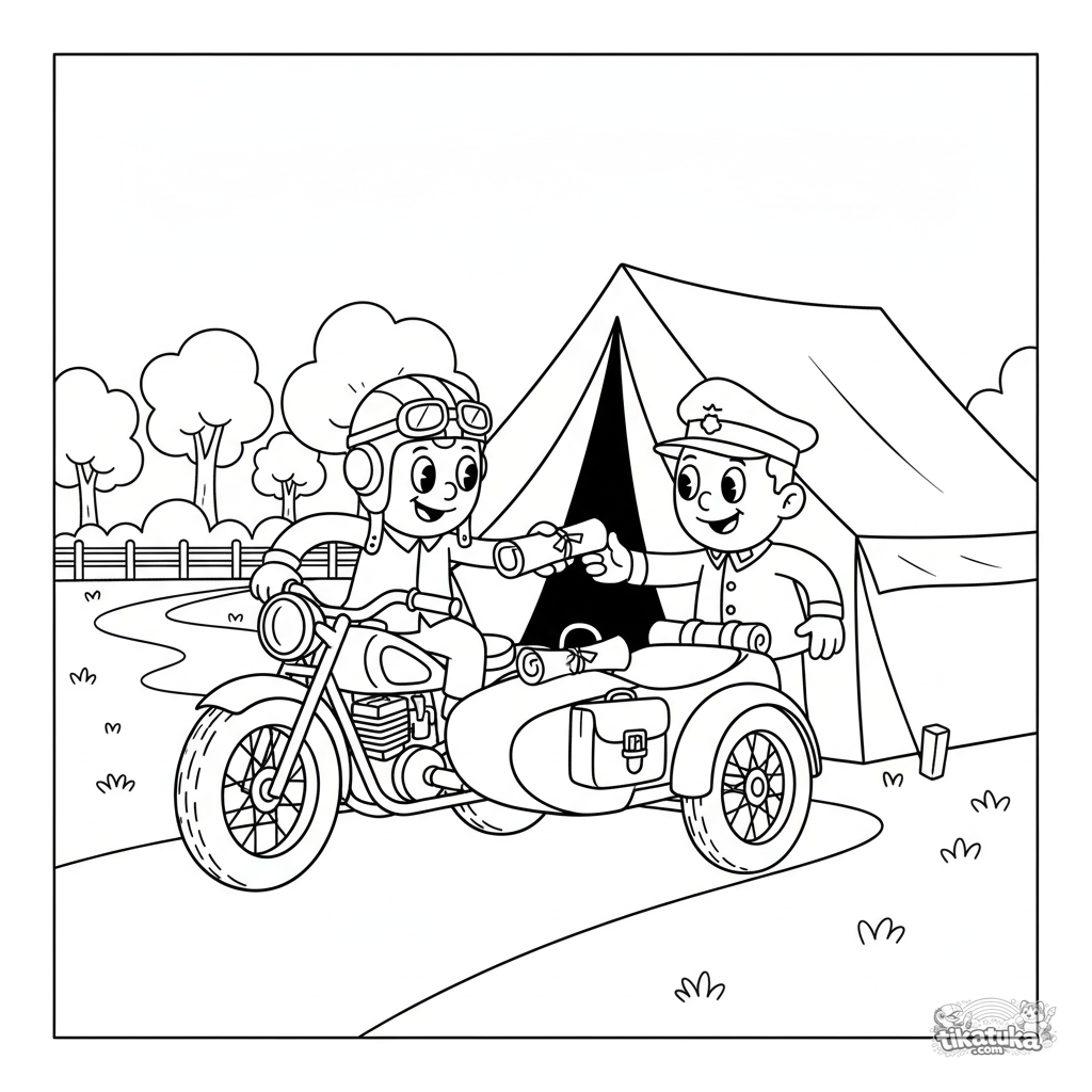 Coloring page for kids 7-9 in retro style: a vintage army motorcycle with a sidecar, where a messenger delivers documents to the command tent. An officer receives the dispatch. Dynamic scene.