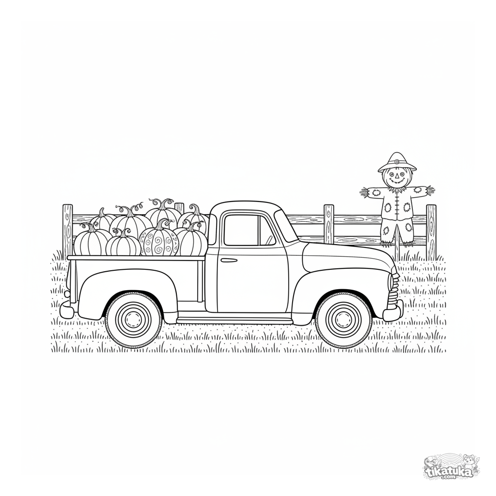 Detailed coloring page for boys 7-12: a intricately drawn vintage pickup truck loaded with pumpkins sits in a farm field. Realistic style, many elements to color.