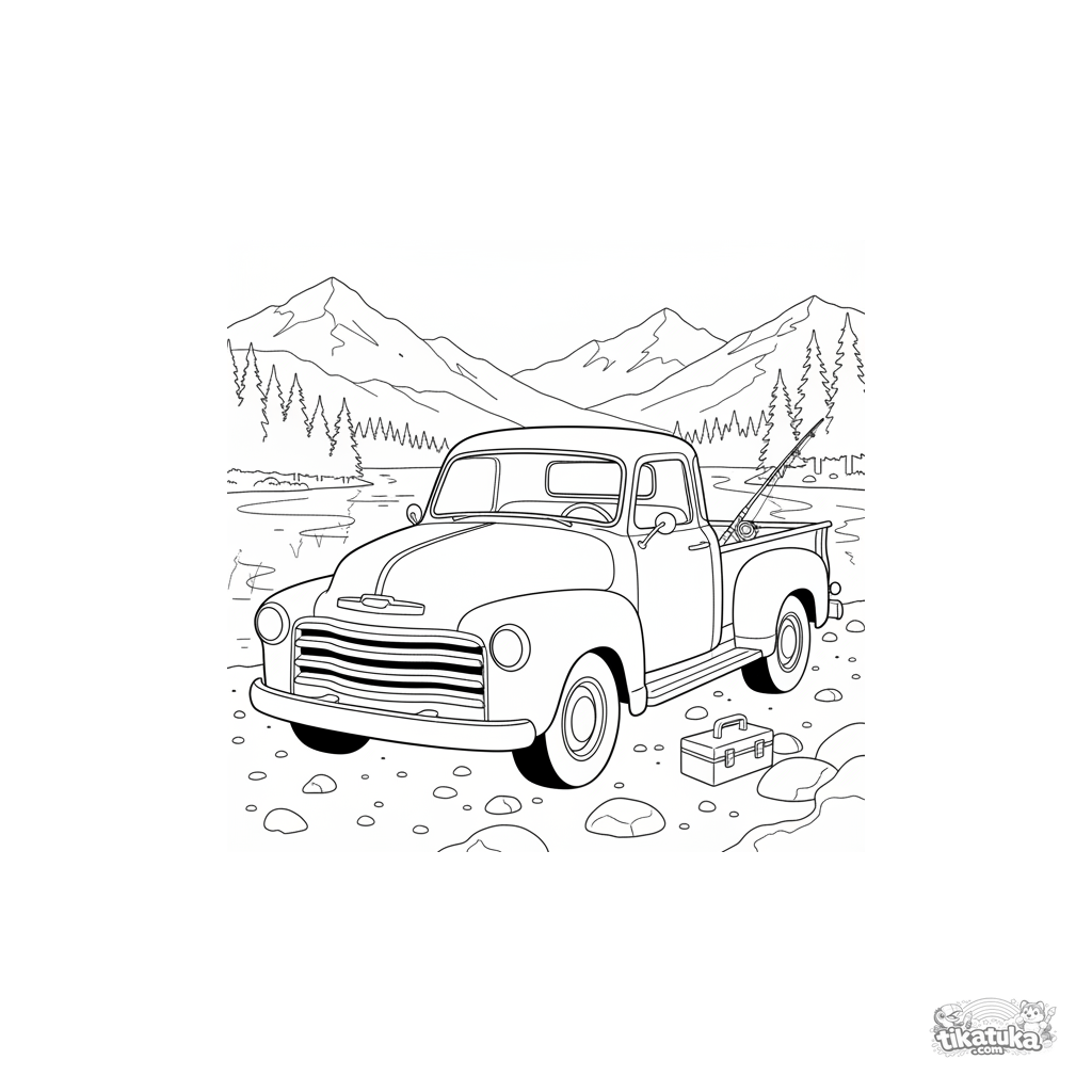 Coloring page for boys 4-6: a vintage pickup truck parked by a mountain lake with fishing gear. Realistic style with detailed vehicle features.