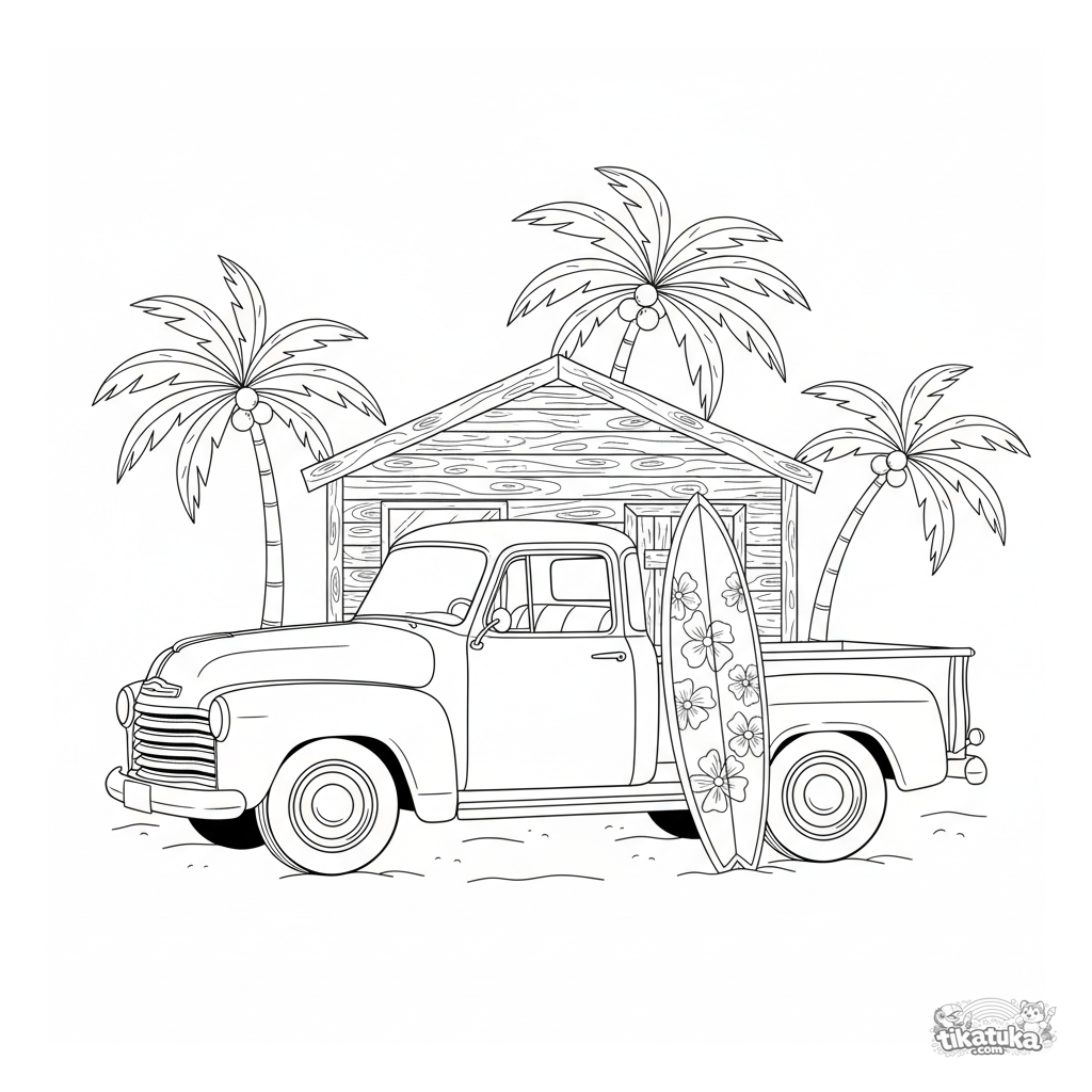 Detailed coloring page for boys 7-12: a retro pickup truck in a realistic style is parked at a beach shack with a surfboard. Many elements for careful coloring.