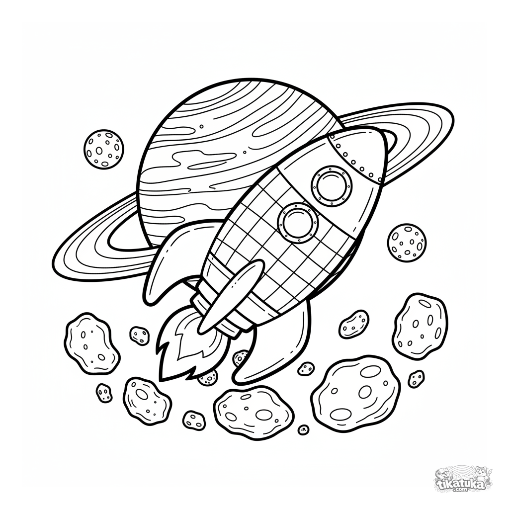 Coloring page for kids aged 5-8: a stylish retro rocket ship flies near a giant ringed planet and an asteroid field. Clear outlines on a white background.
