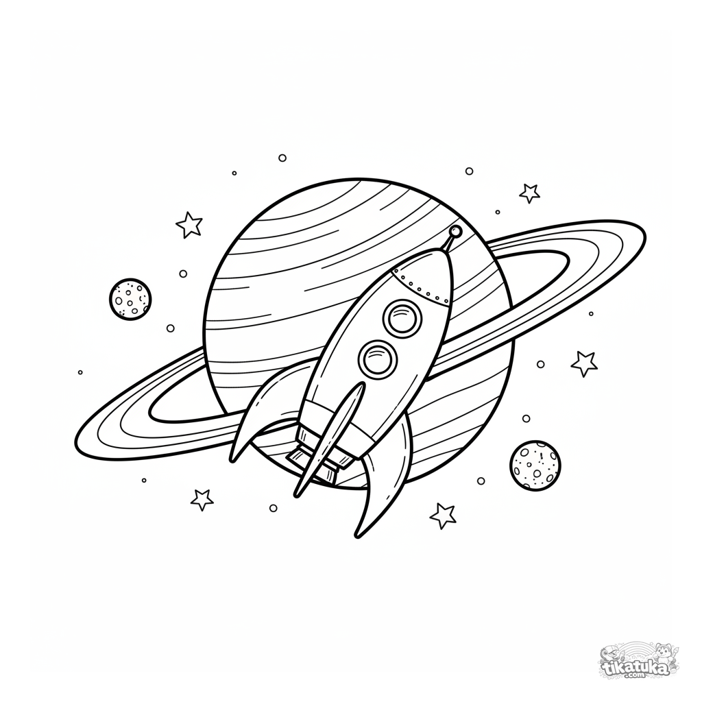 Coloring page for kids 5-8: a 1950s-style retro rocket ship drifts in orbit around a giant ringed planet. A realistic space scene.