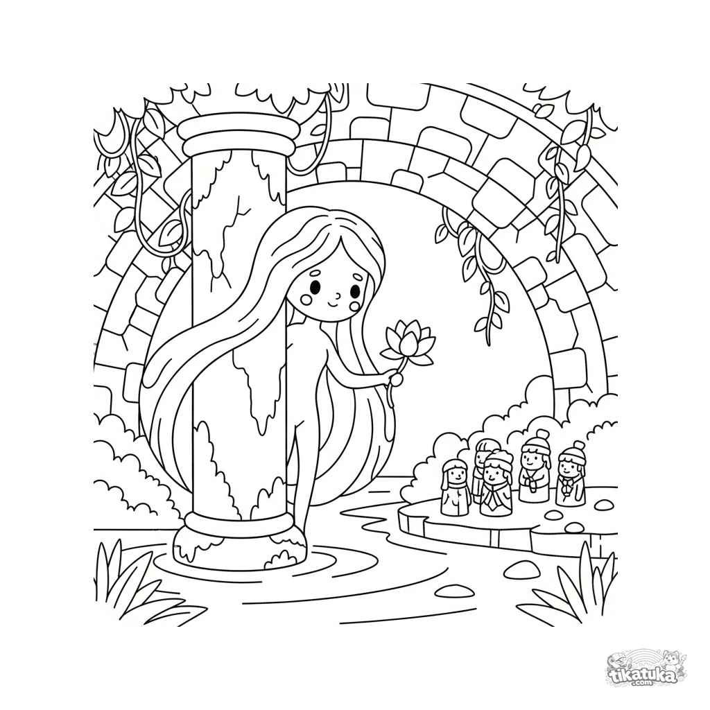 Kids coloring page: a river nymph offers a flower to travelers at a ruined bridge in amphitheater ruins. A kind meeting scene from myths.