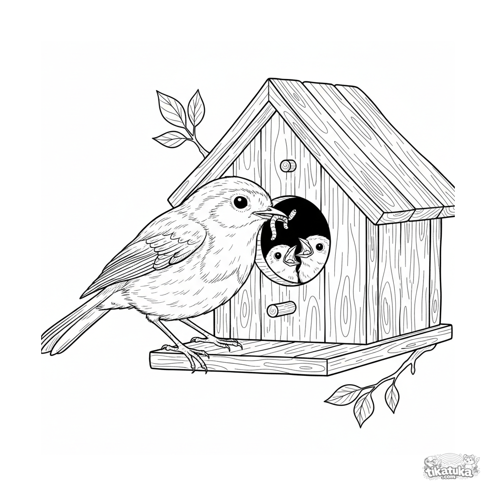 Complex realistic coloring page for older kids 10-12: a robin delivering an earthworm to its chicks in a wooden birdhouse. Detailed rendering of feathers, wood grain, and spring leaves.
