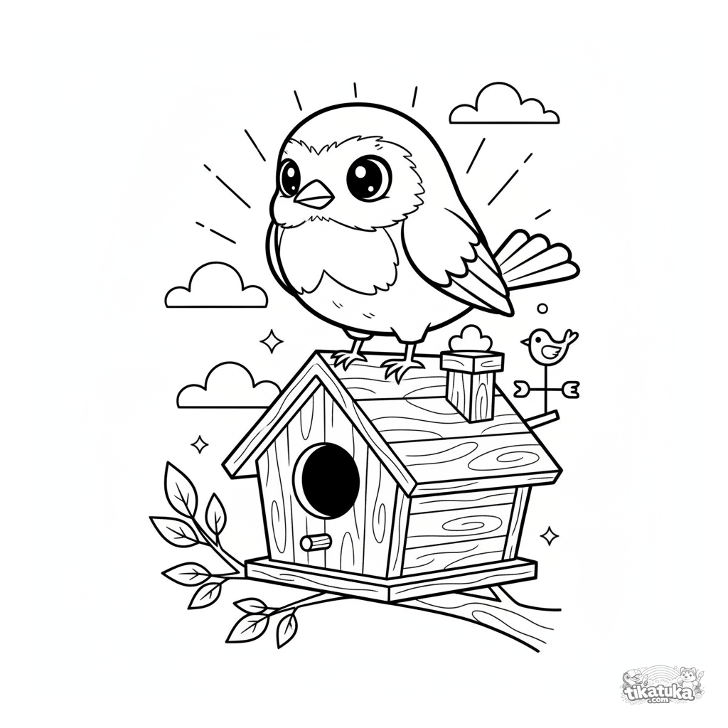 Coloring page for tweens 7-9 in comic style: a robin standing guard on the roof of a birdhouse. Dynamic pose, expressive eyes, a protective scene.