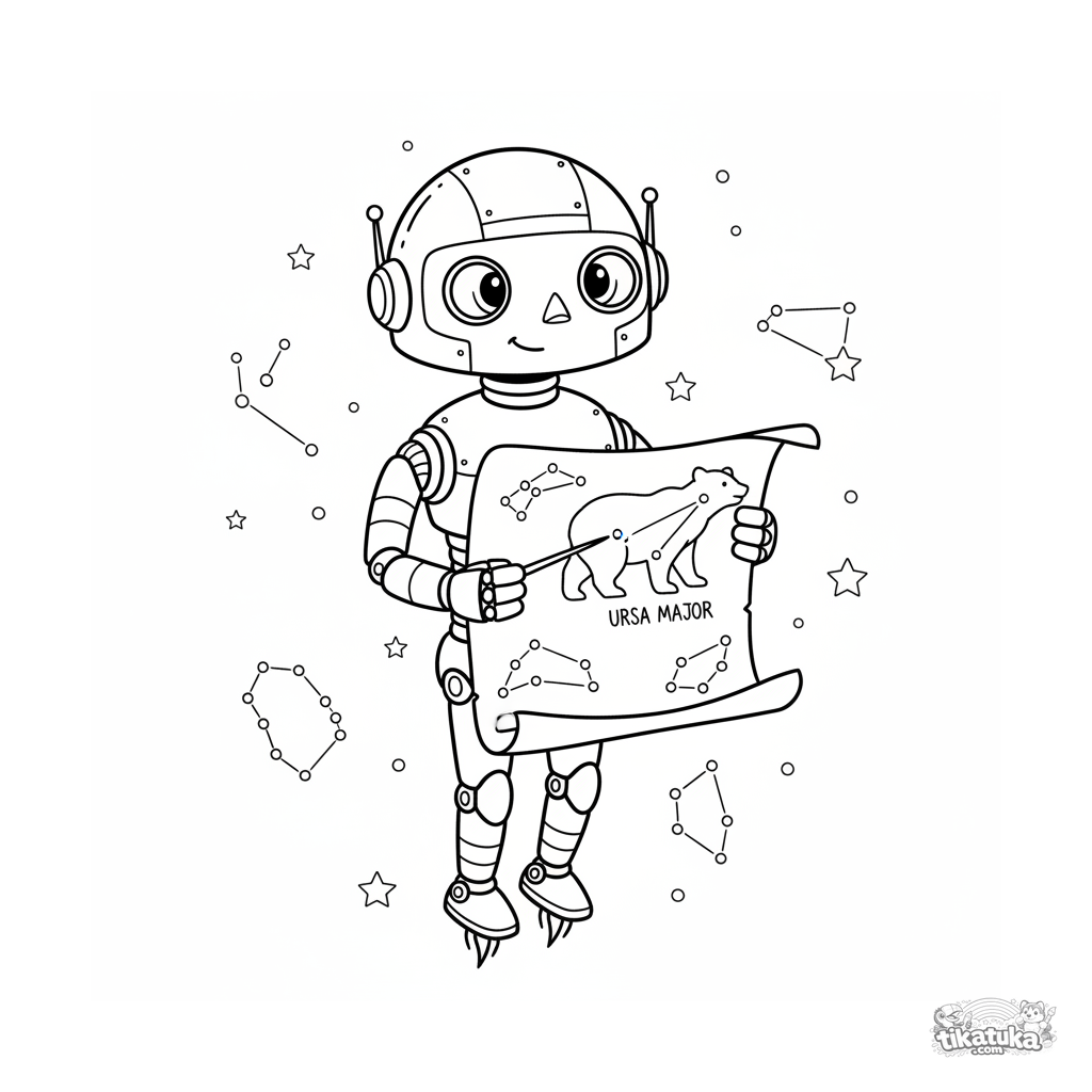 Coloring page for tweens 7-9: a scientist robot in outer space mapping constellations. Detailed robot, star chart, educational scene.