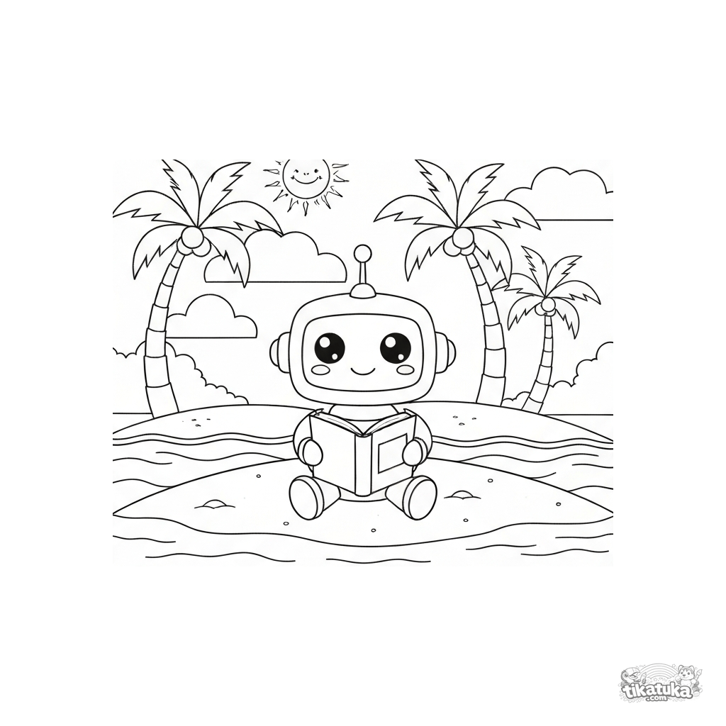 A friendly robot relaxes on a tropical island reading an interesting book. Color the palm trees, the sea, and the fun story!