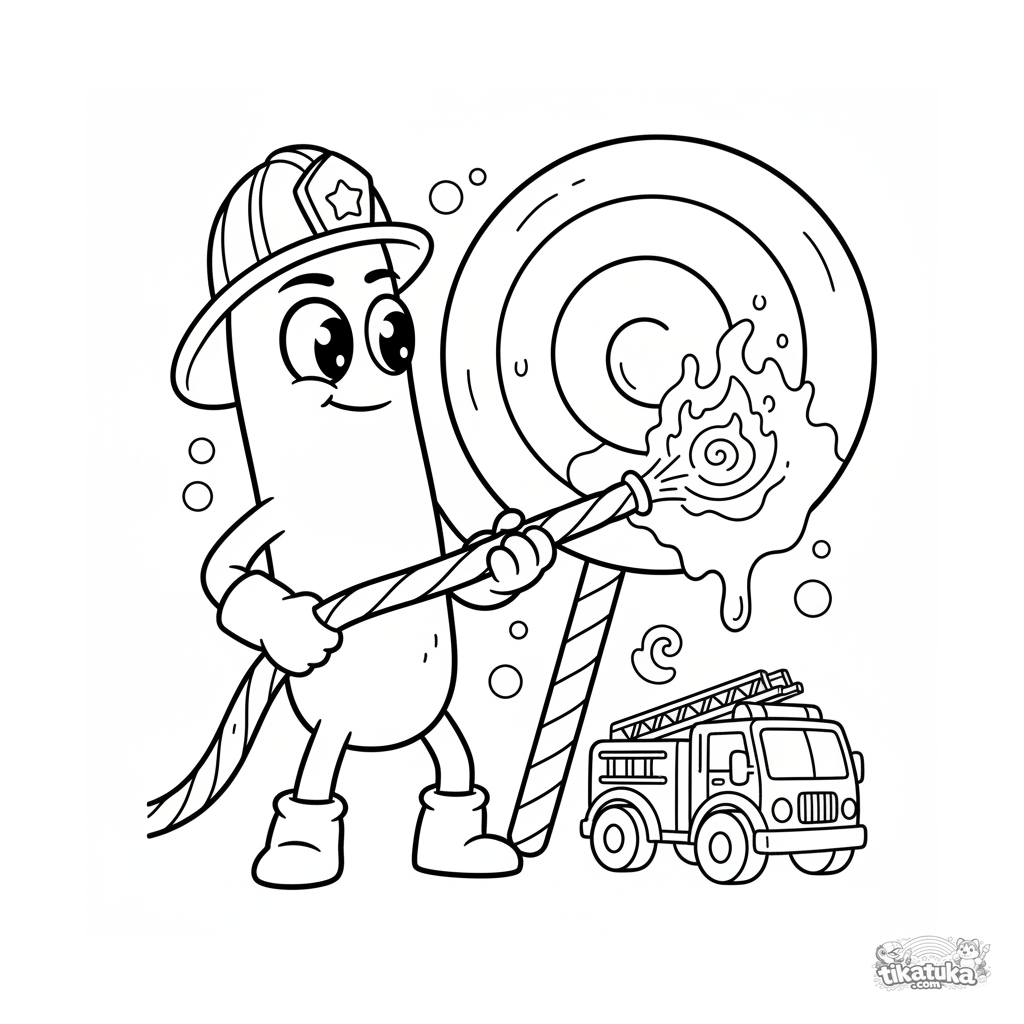 Coloring page for tweens 7-9: a rod-shaped bacterium firefighter extinguishes a sugar blaze on a lollipop with a licorice hose. A dynamic scene in a comic adventure style.