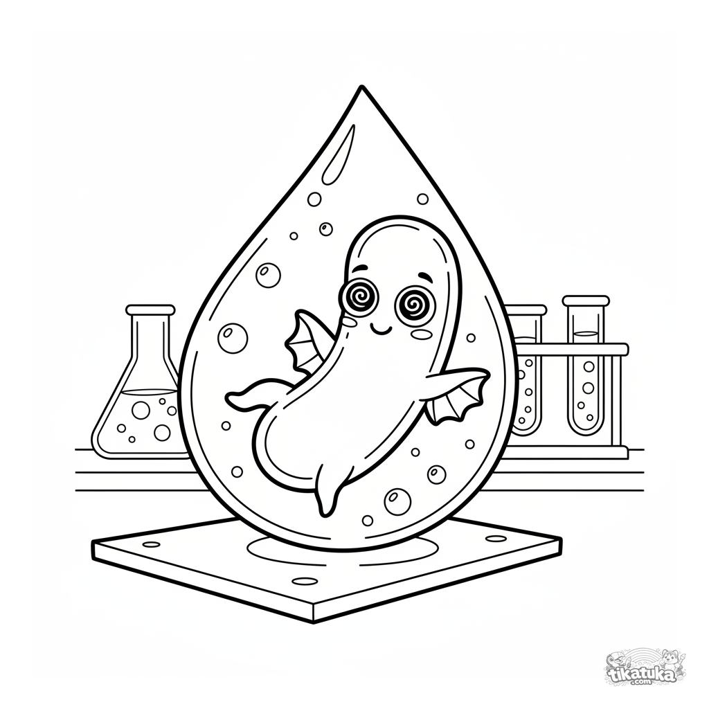 Kids coloring page: a rod-shaped bacterium gently floats in a water droplet on a slide. Color the flippers, hypno eyes, and bubbles.