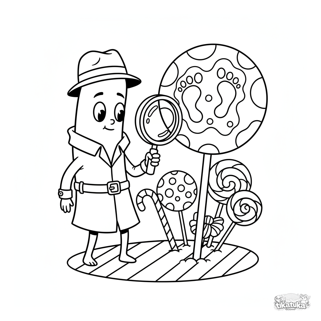 Coloring page for kids 7-9: a rod-shaped bacterium in 90s cartoon style, dressed as a detective, investigates a mystery on a lollipop. A funny scene with a detective story element.