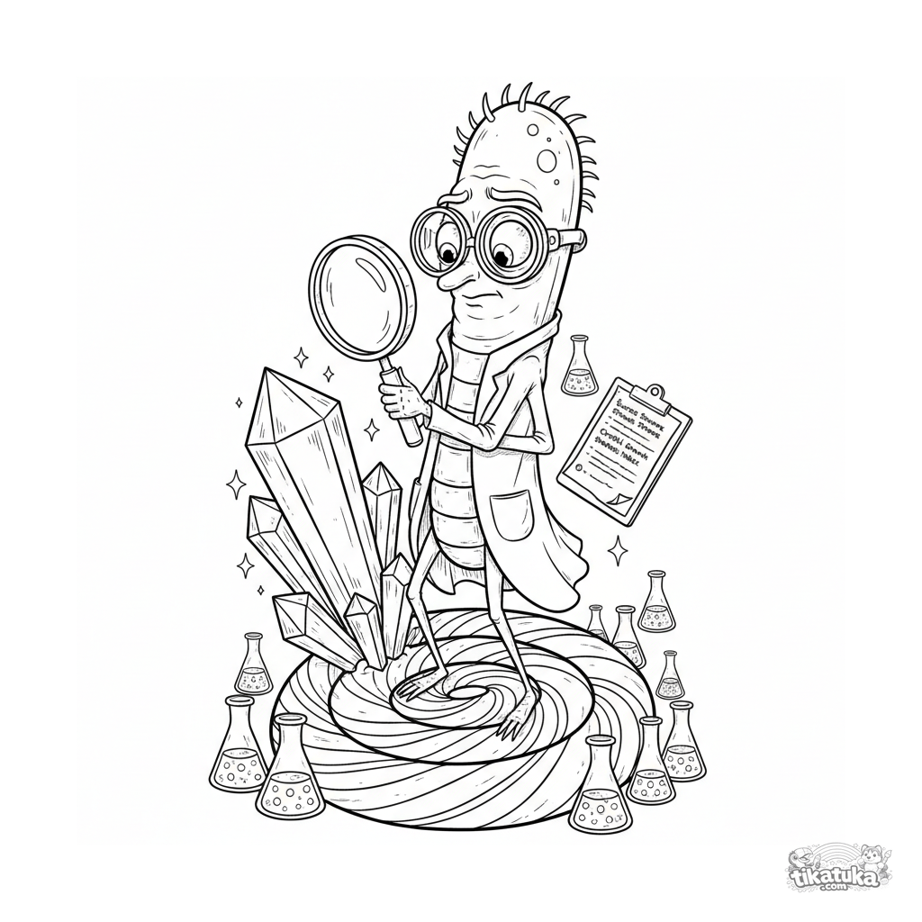 Detailed realistic coloring page for kids 10-12: a rod-shaped microbe scientist in goggles and lab coat studies sugar crystals on a lollipop surface. Scene in a field-guide style.