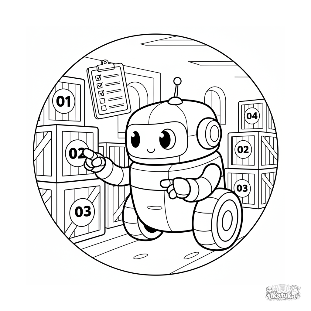 Coloring page for kids 4-6: a rolling robot scans crates in a warehouse. The robot has a manipulator arm and a holographic clipboard. Clear outlines and balanced details.