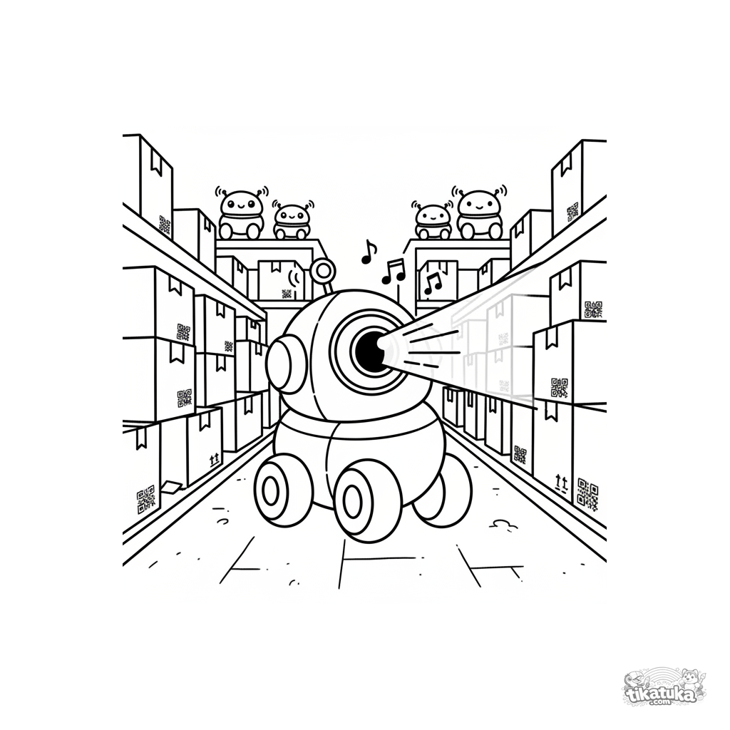 Coloring page for kids 4-6: a round wheeled robot scans QR codes on boxes in a warehouse aisle. Clear shapes and moderate detail.