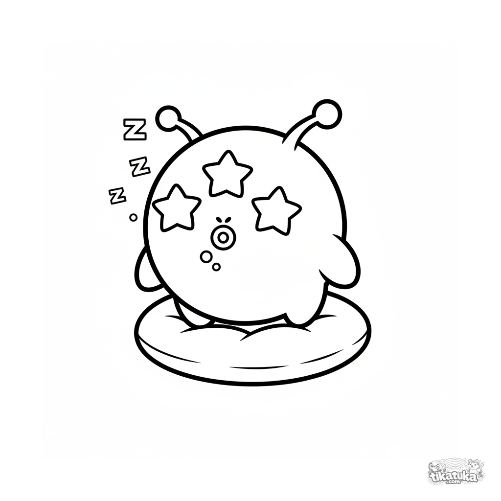 Kawaii-style coloring page for toddlers 2-3: a round friendly alien sleeps above a cushion. Very simple shapes, starry eyes.