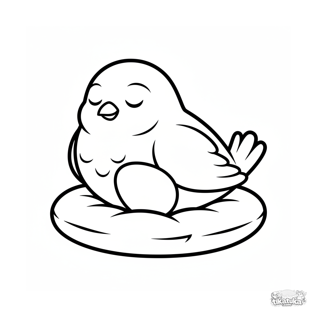 Field-guide style coloring page for toddlers: a bird sits on an egg on a cushion. Clear outlines, recognizable shape, simplified details for ages 2-3.