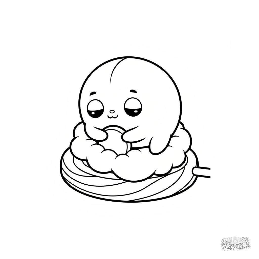 Simple coloring page for toddlers 2-3: a round plush microbe naps sweetly on a candy-floss cloud on a lollipop. Large shapes, wide margins.