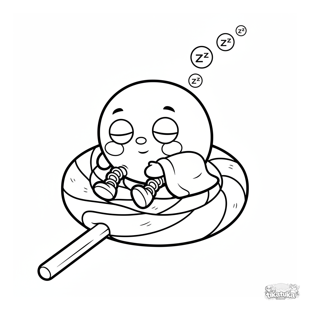 Simple coloring page for toddlers 2-3: a round plush microbe naps on a lollipop. Large shapes, few details, perfect for first crayons.