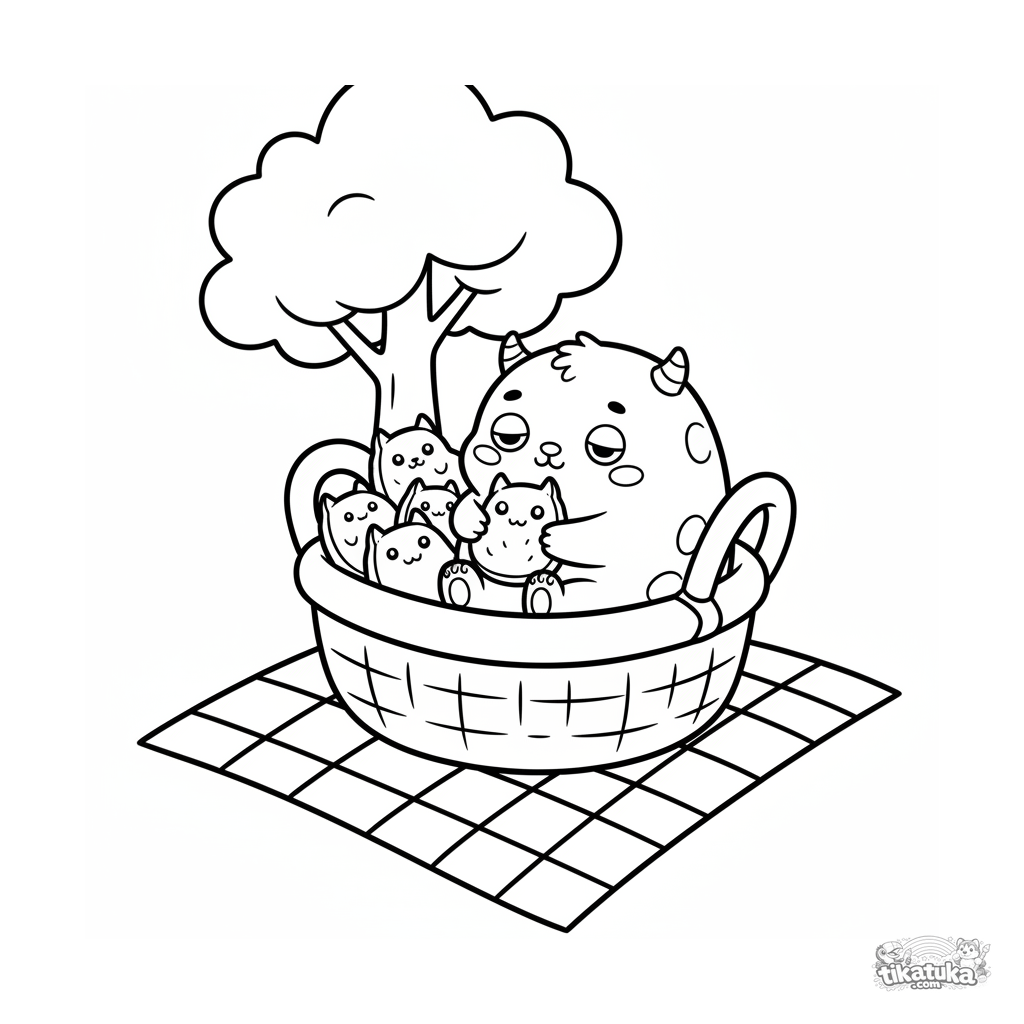 Toddler coloring page 2-3: a round monster baby napping in a cookie basket at a picnic. Simple, large shapes perfect for first coloring.