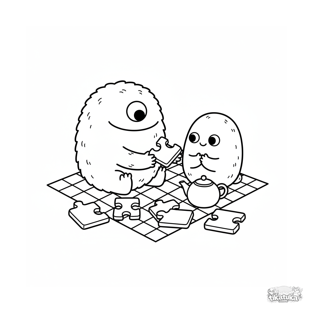 Coloring page for kids 4-6: a round chibi monster shares a puzzle-shaped cookie with a friend at a picnic. Cute scene about friendship and generosity.