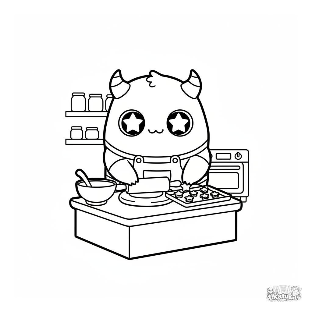Coloring page for kids 4-6: a round monster with horns in an apron baking cookies in a mini kitchen. A fun and appetizing scene for coloring.