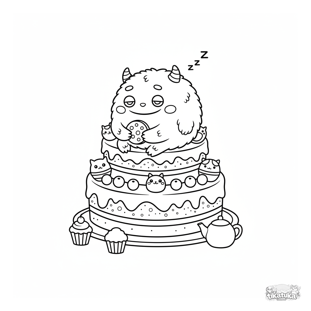 Simple toddler coloring page: a round fluffy monster napping on a big cake at a picnic. Large shapes, minimal detail, for ages 2-3.