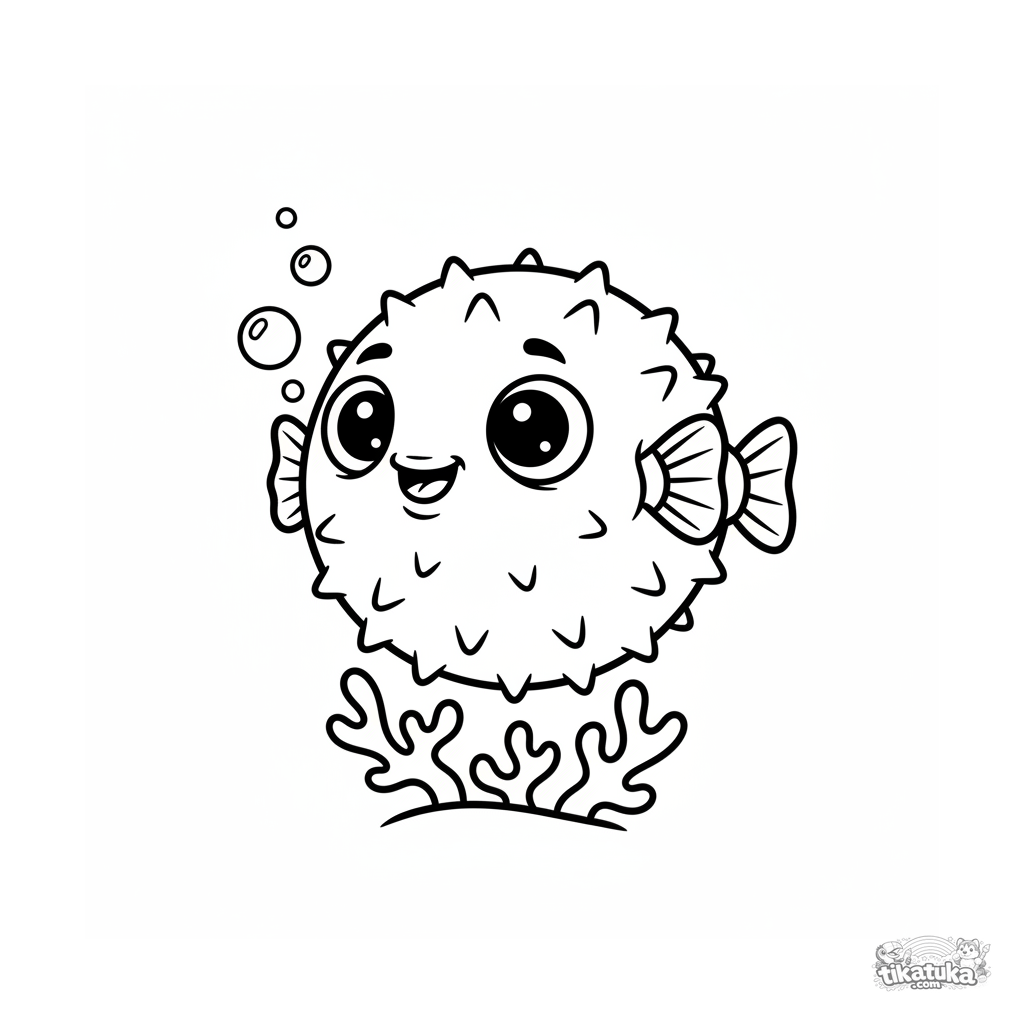 Simple coloring page of a cute pufferfish inflating near coral in the sunny shallows. For toddlers 2-3 years old, with large shapes and very wide margins.