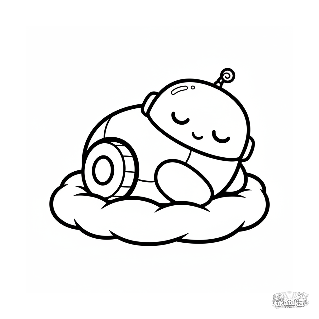 Simple coloring page for kids 2-3 years: a round friendly robot rests on a cushion. Minimal details, large areas for coloring.